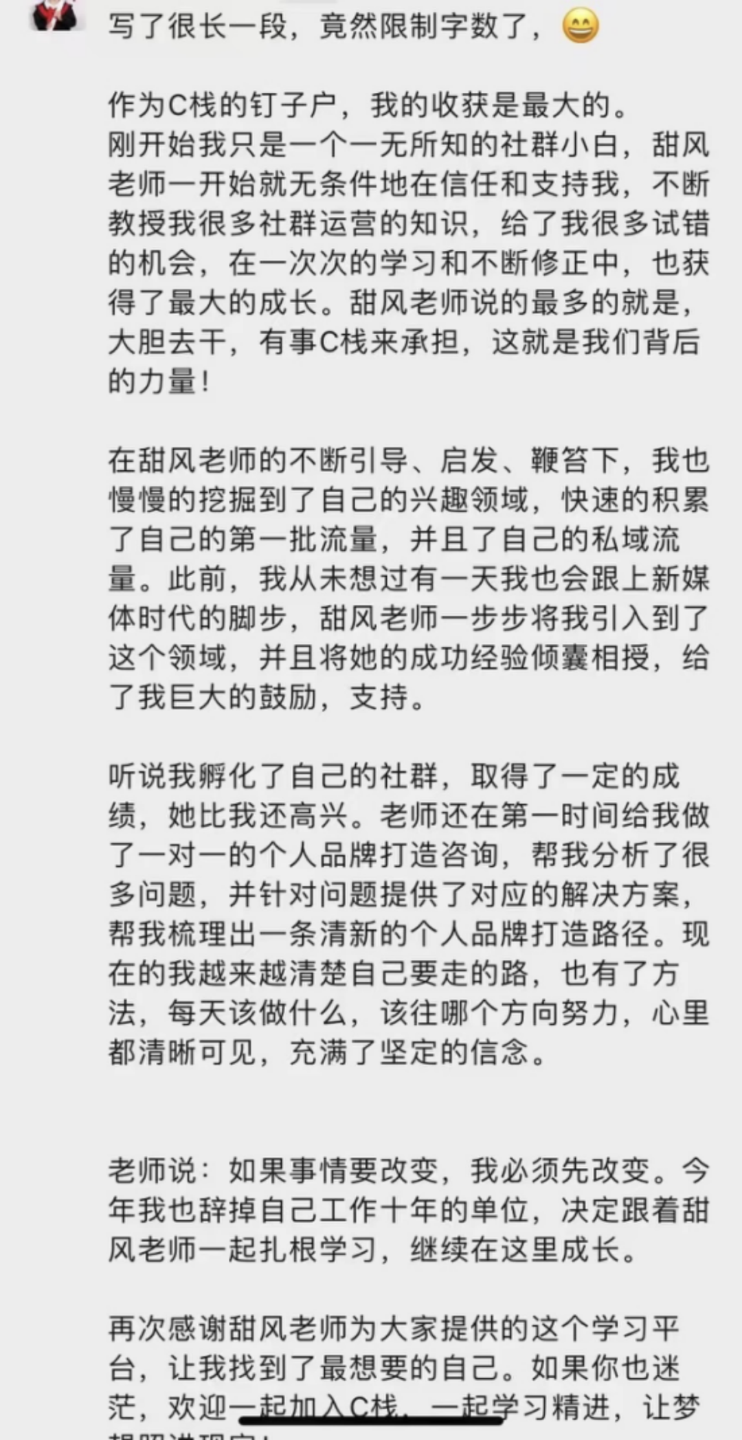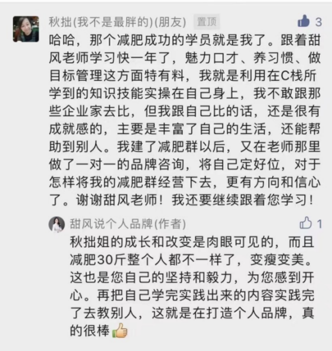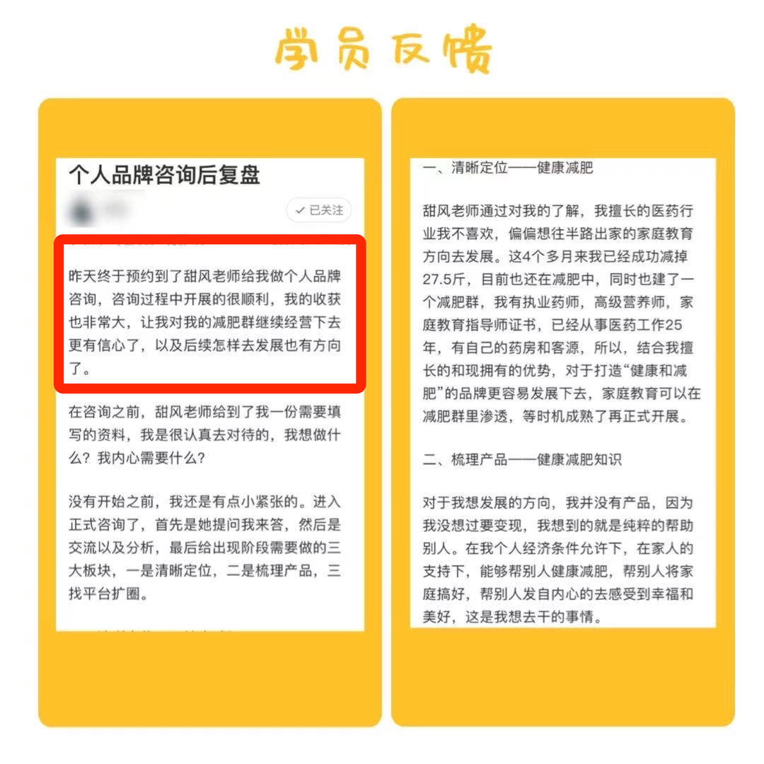 每天4点50起床学习,每周坚持跑步25公里,用一天时间实现10倍速成长。不断“试错-精进”后,我推出了100课时的《高效能人士的自我管理必修课》,在喜马拉雅APP免费上线。因干货满满,被学员强烈建议“求收费”;后续推出C栈成长俱乐部年度会员,收费了,学员却依旧“不满”:定价太低啦!!!大家的肯定给了我信心,但时至今日,我依旧坚持《高效能》免费开放,算是一份回馈吧。腾讯CEO马化腾、小米创始人雷军、京东CEO刘强东、今日头条创始人张一鸣……跟什么人在一起,决定着你未来的层次与格局。高手之间借力,很多时候就是一句话的事儿。因为过去12年的深耕,我的圈子大都是“高知”:企业家、创业者、领导层、教授……只需很小一笔报名费,就能参与一个高能的企业家社交圈,享受与大佬面对面的机会,不香吗?B.销售出身,当过高层,带过团队,12年来一直跟老板打交道,最了解老板们需要什么如何养粉?如何促进成交?如何把企业销售流程系统化?如何激发团队内驱力?是我过去十几年一直在做的事情。去企业做教练时,企业员工不敢当老板面说的话,却可以掏心掏肺地告诉我。具备足够丰富的资源,了解老板,也理解员工的声音,这大概就是甜风独一无二的地方吧。最忙的时候,一个月有26位创业者找我进行个人品牌咨询。一位做了23年润滑油生意的老板,想二次创业,却不知如何入手,便转了1580元的费用向我咨询。我先让他填写了咨询表,并根据表格内容,为他量身打造了个人品牌定位-产品体系梳理-全渠道运营流量-线上团队搭建等全方位实操流程。聊了不到一小时,对方便转来1万元感谢红包,表示“太有收获了,感谢你帮我避开了很多风险!”我连连推拒,对方却表示:“甜风老师,你就收下我的小小心意吧!你的咨询绝对不止这个价钱!”思虑再三,我决定收下他的心意,同时,送了他一年的免费一对一咨询。遇到瓶颈时,对方第二次向我咨询。我从线上的自媒体矩阵、线下沙龙、养粉丝、积流量入手,详细介绍了打造个人品牌的“法宝”。对方听完,当场转账,要报名我近两万元的C栈私董。那时候,私董这个项目还仅仅只是一个想法,并没有明确的文字化的权益内容。我再次拒绝:“之前已经付过1万了,再加入只要加9800元就行。”对方却坚持要支付19800元,令我深受感动:“那我专门去一趟您公司,见面帮您梳理,或者帮你们公司免费做一天线下培训吧。”朋友说我“一送就送价值三五万的课,真的没有商业头脑”,但我只是不想占人便宜,也更希望竭尽所能,服务到那些无条件信任我的人。「C栈」还处于起步阶段,步履维艰,能得到每一份信任支持,真的弥足珍贵了,我不能辜负!可能“傻人有傻福”吧,秉承利他的初心和理念,「C栈」慢慢打出了自己的品牌,帮助了超1000人进阶成长。他们中有:创业者、企业家、投资人、资深HR、管理者、职业经理人、微商、保险从业者、宝妈……