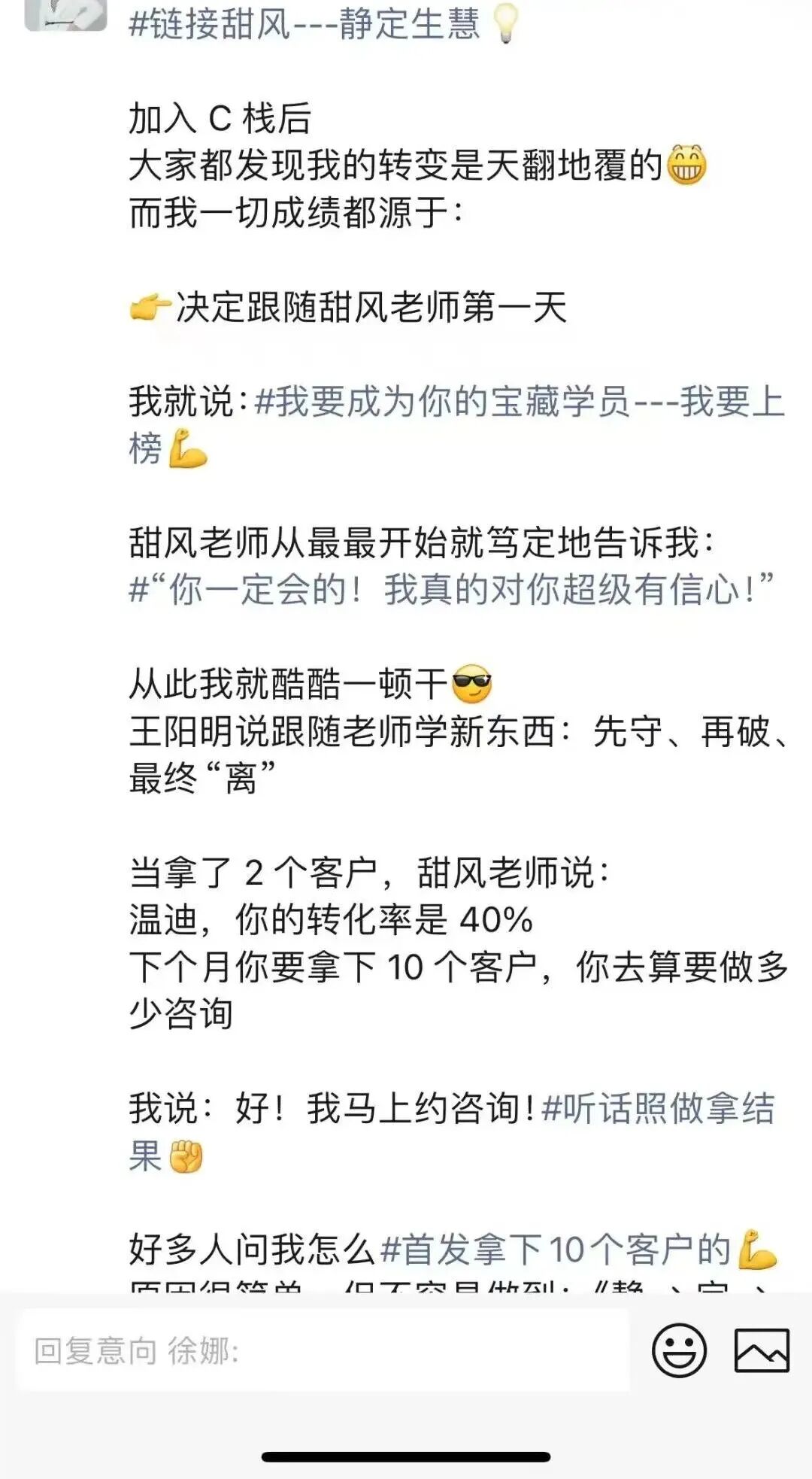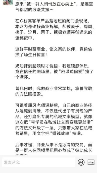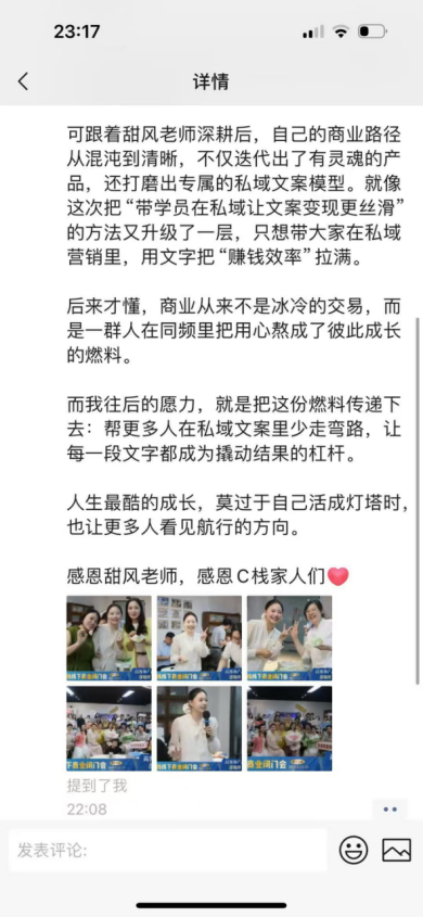 她感慨,曾几何时自己做商业十分笨拙,拿着零散方法瞎摸索,直到跟着甜风老师深耕,商业路径才从混沌走向清晰,不仅迭代出有灵魂的产品,还打磨出专属的私域文案模型,“后来才懂,商业从来不是冰冷的交易,而是一群人在同频里把用心熬成了彼此成长的力量”。