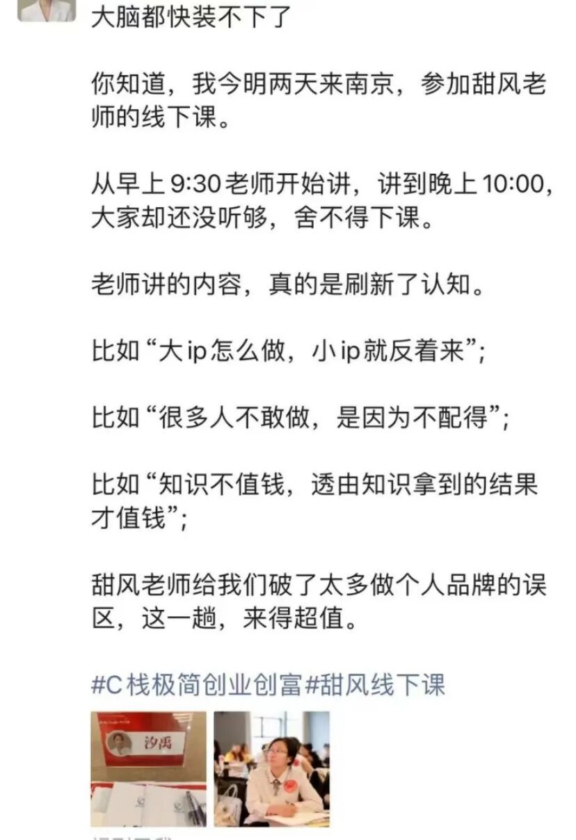 不少学员在课后反馈,甜风老师的授课内容彻底刷新了认知:“大IP怎么做,小IP就反着来”“很多人不敢做,是因为不配得”“知识不值钱,透过知识拿到的结果才值钱”,这些观点打破了太多做个人品牌的误区;