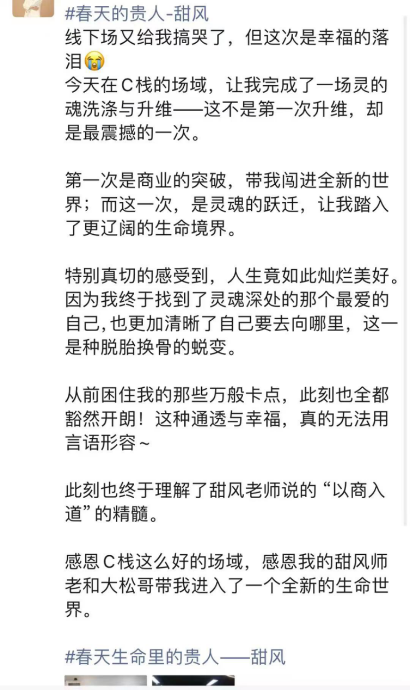 春天说: “在C栈的场域完成灵魂跃迁,踏入更辽阔的生命境界。从前的卡点全然开朗,终于找到灵魂深处最爱的自己,这是脱胎换骨的蜕变,也终于理解‘以商入道’的精髓。”