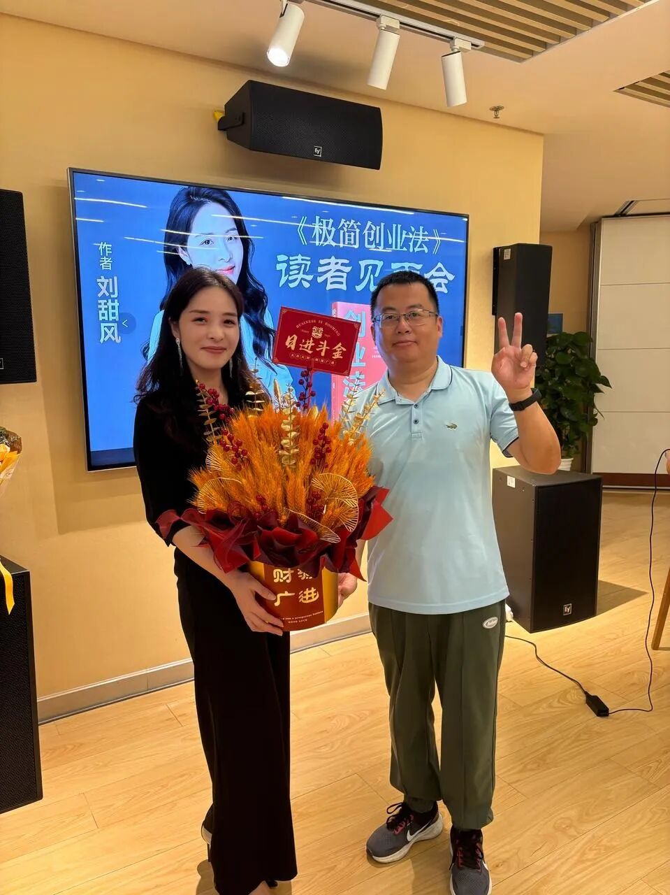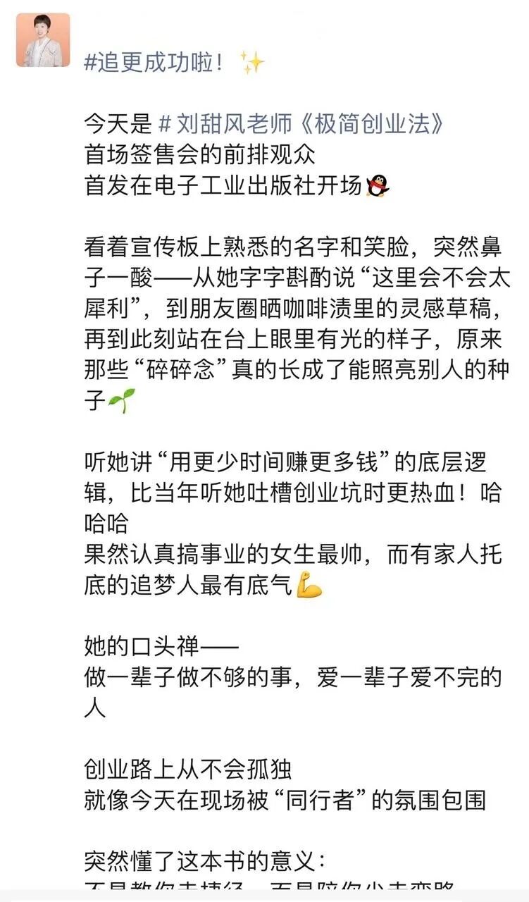 她不仅悄悄请来了总社的摄影老师、分社社长,还提前布置好了会场,连鲜花都是按我喜欢的色系准备的。分享结束后,社长站上台说“甜风老师的故事非常打动我,这本书一定要让更多创业者看到!”