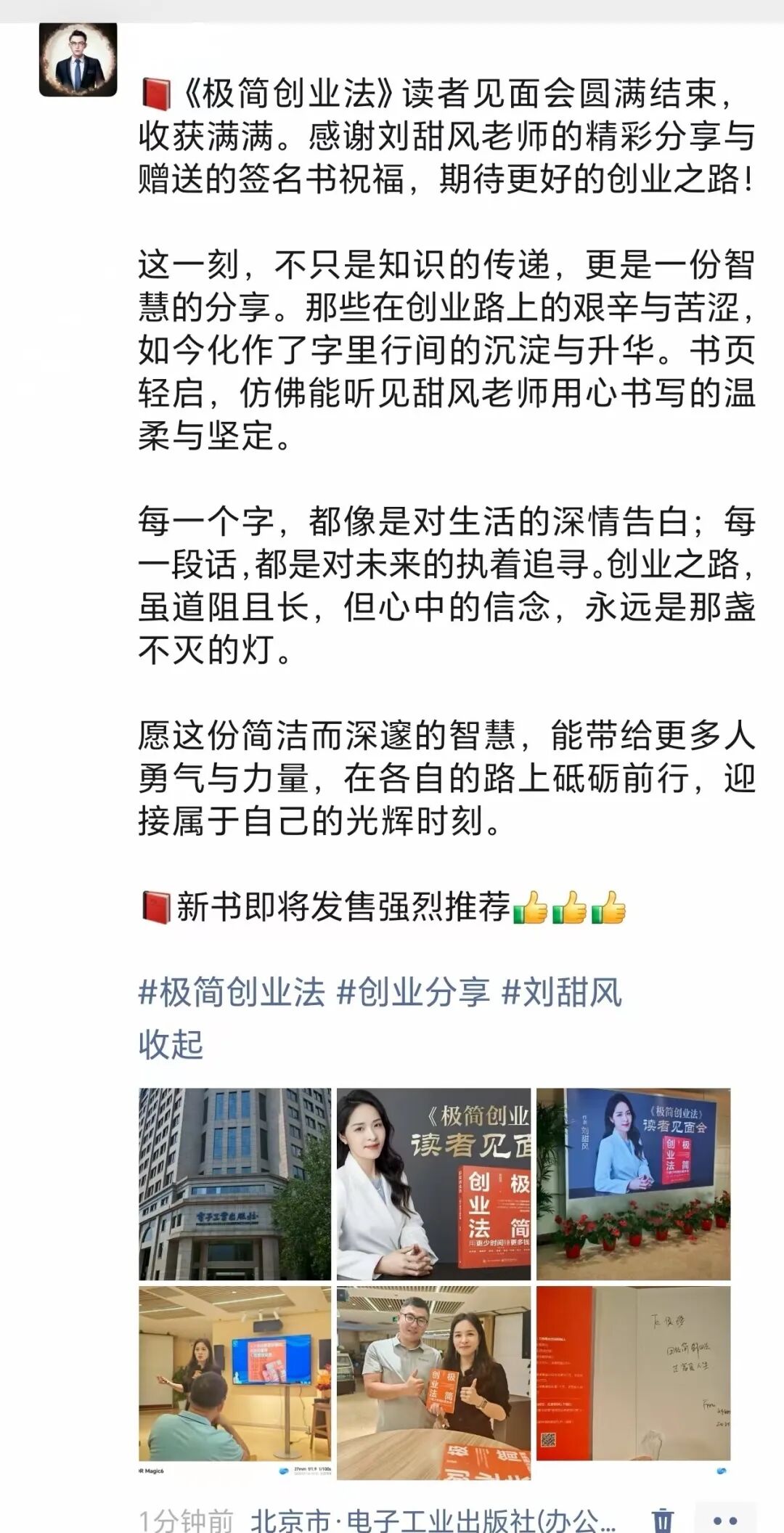 有读者认真记笔记的侧脸,有学员举着书合影的笑脸,有大家帮忙忙前忙后的背影……突然想起写《极简创业法》时的一个念头。