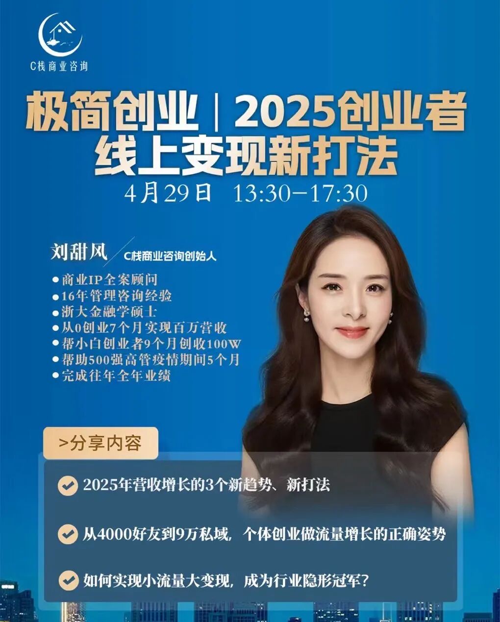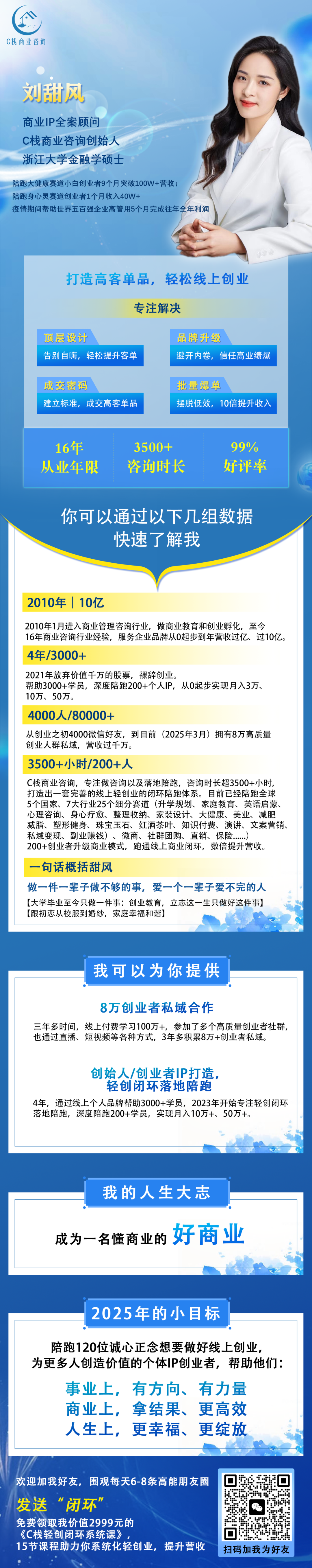 我和团队花数月,打磨了一套课程《c栈轻创闭环系统课》,价值2999元,这套内容对于想要启动线上创业的人、知识IP创业者、传统企业转型线上的老板们来说,听懂了,就是价值百万。